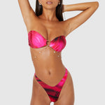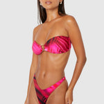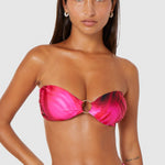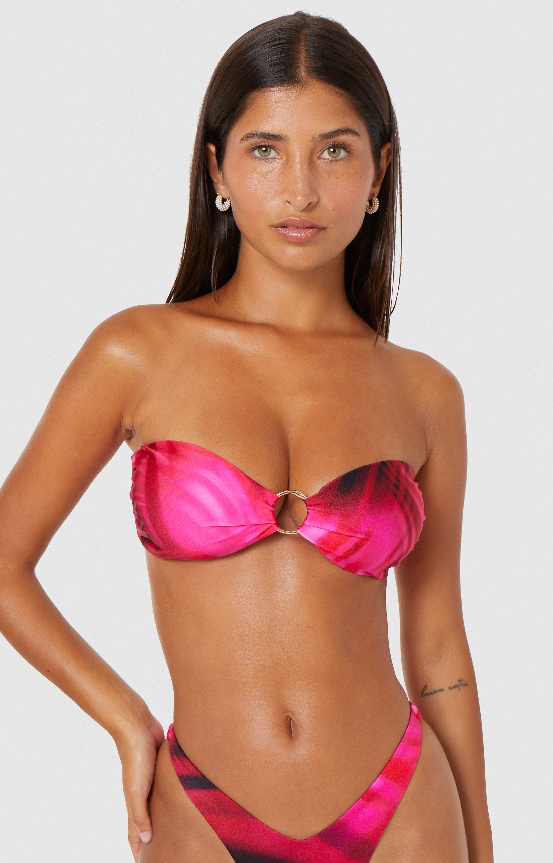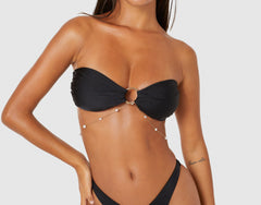 Our INDAH bandeau bikini top makes her debut. She's not just your average bandeau, with a silicone strip to ensure there's no slippage, she's cut to perfection to ensure you have support but the most flattering fit. Detailed with an asymmetric gold ring & back clasp. Elevate your look with our SORELLA bodychain that flows through the asymmetric gold ring detailing.