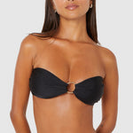 Our INDAH bandeau bikini top makes her debut. She's not just your average bandeau, with a silicone strip to ensure there's no slippage, she's cut to perfection to ensure you have support but the most flattering fit. Detailed with an asymmetric gold ring & back clasp. Elevate your look with our SORELLA bodychain that flows through the asymmetric gold ring detailing.