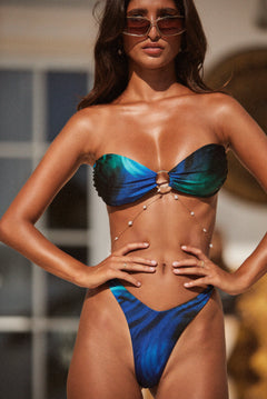 Our INDAH bandeau bikini top makes her debut. She's not just your average bandeau, with a silicone strip to ensure there's no slippage, she's cut to perfection to ensure you have support but the most flattering fit. Detailed with an asymmetric gold ring & back clasp. Elevate your look with our SORELLA bodychain that flows through the asymmetric gold ring detailing.