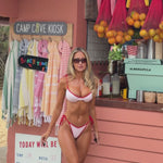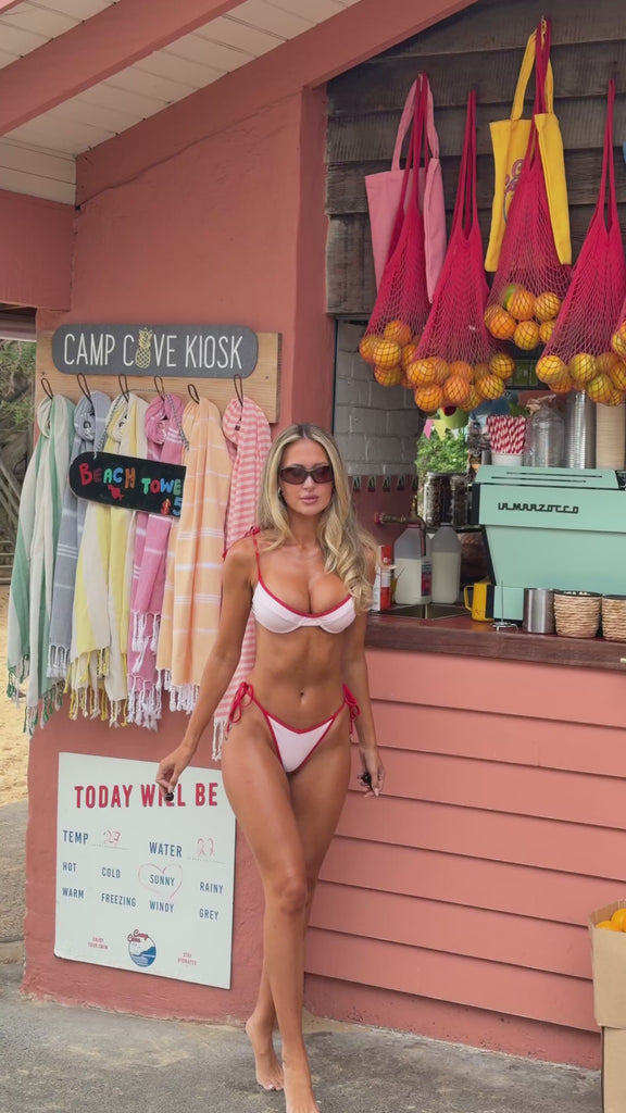 Our Kylie top, perfect to pair with Mila and Tate. Designed with an underwire to keep the girls in place and give you support. We know that the girls need an adjustable back, thats why you have got 3 different back lengths to choose from. Made with pink fabric paired with cherry red binding, the hottest combo of the summer.