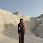 An epitome of modern elegance and daring style. This stunning black dress features an asymmetrical design with a one-sleeve silhouette. The striking cutouts along the bodice reveal just the right amount of skin, creating an alluring yet tasteful look. A ruched side detail with adjustable ties adds a touch of texture and allows for a customizable fit, while the high slit enhances its dramatic flair. Crafted from a sleek, form-fitting fabric, the Madison Dress beautifully contours the body, making it the perfect choice for an unforgettable evening. Pair it with statement accessories to complete the look and make a bold fashion statement.