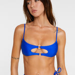 This classic open-front bikini is every bit timeless, cheeky and sexy. connected with two small rings at the front and a strappy knot-tie in the back, the NAYA bikini top fits perfectly with medium coverage at the front and skin, skin, skin at the back.